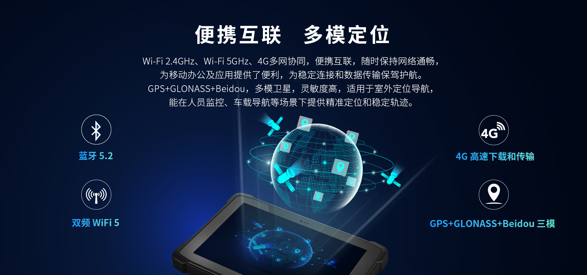 500W+1300W高分辨率前后置雙攝像頭,輕松采集工作圖像和視頻信息,3G/4G全網(wǎng)通、雙頻WiFi5、藍(lán)牙等多種通訊方式,無(wú)線通訊功能強(qiáng)大:支持GPS,Glonass,北斗定位系統(tǒng),定位更準(zhǔn)確:
