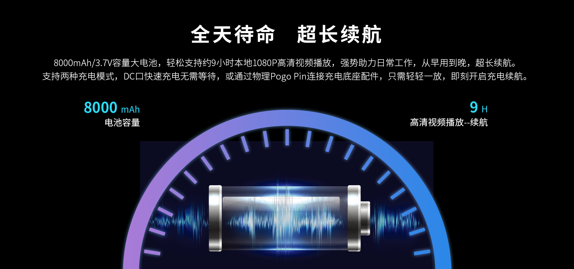 內(nèi)置8000mAh/3.7V聚合物鋰離子電池,機(jī)器續(xù)航能力9小時(shí)